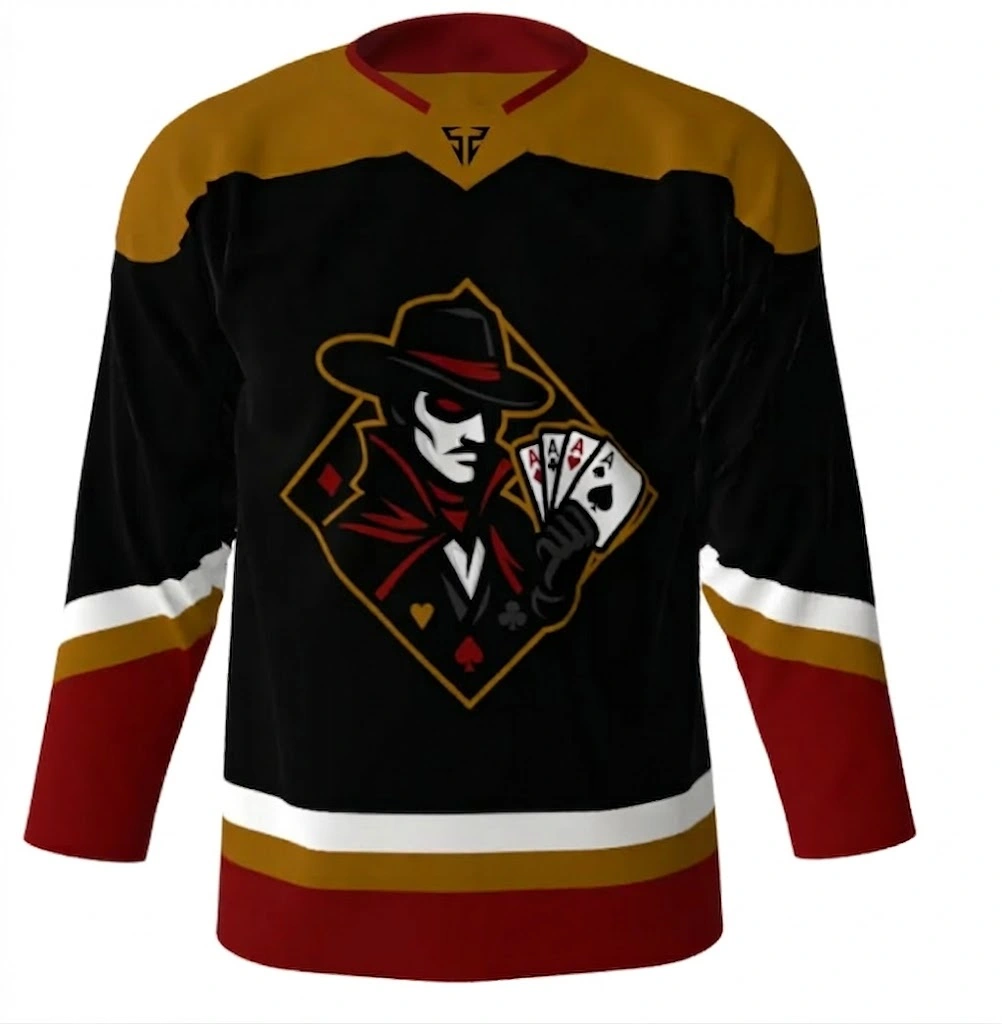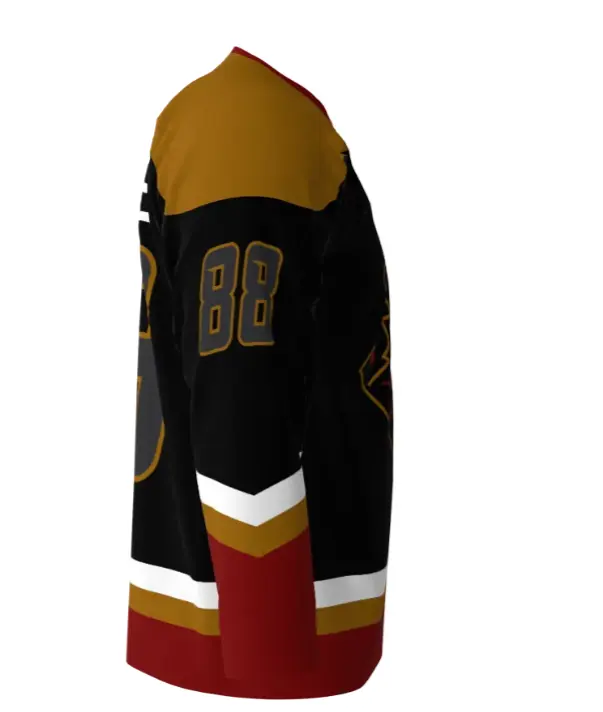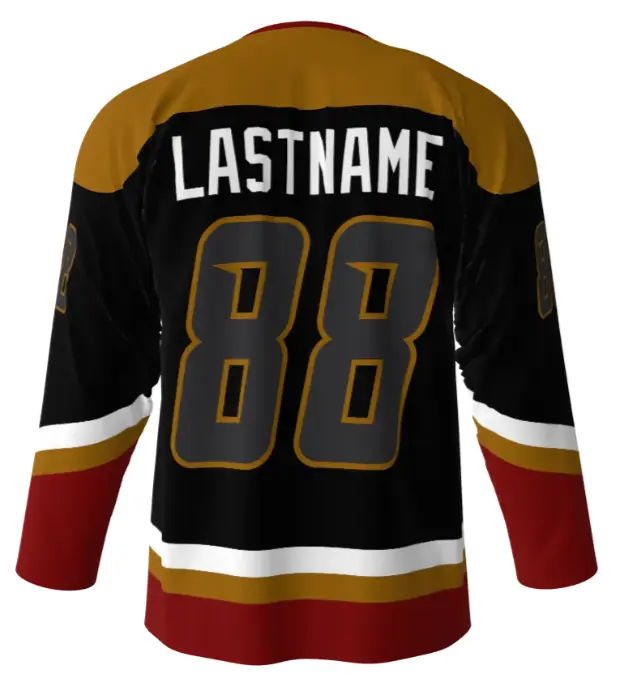 Play like a pro with this long-sleeve hockey jersey. The Aces Black Hockey Jersey features a long-sleeve design that gives you more ease and comfort during games and practice. It allows you full arm movement which makes it perfect for training and playing. Its unique design features a bold black body with gold shoulder panels and white, gold, and red striped details on the sleeves and bottom. This comfortable jersey is perfect to wear both for games and casual wear.