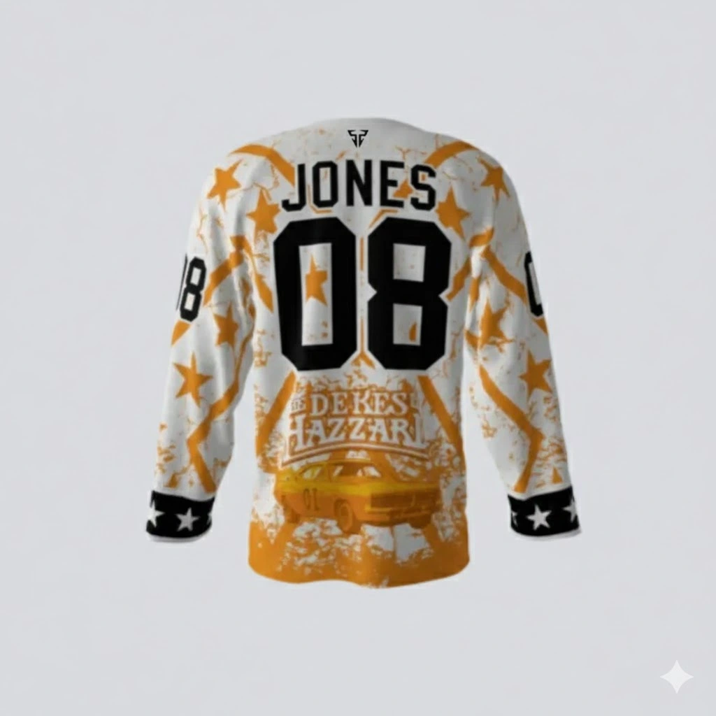 Show your team spirit with the Dekes Of Hazard White Hockey Jersey. Its long-sleeve design gives you more ease and comfort. It allows you full arm movement which makes it perfect for skating and playing. Its modern athletic look with white, orange, and black colors gives you another level of confidence. This comfortable jersey is perfect to wear both for competition and casual wear. This jersey is made from soft and breathable fabric which keeps you cool and dry during games or casual wear. We use polyester and spandex fabric for this jersey. It’s lightweight and comfortable which helps you move in any direction during play. The strong fabric makes it last longer and stay in better condition for years.