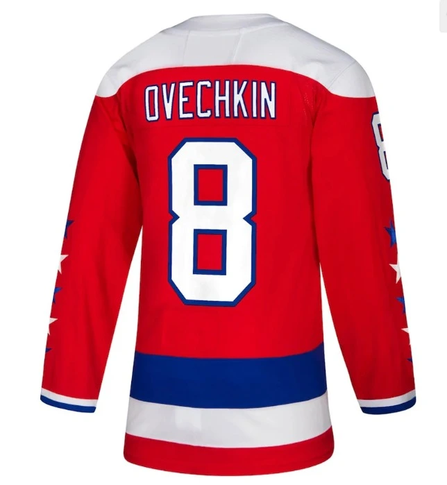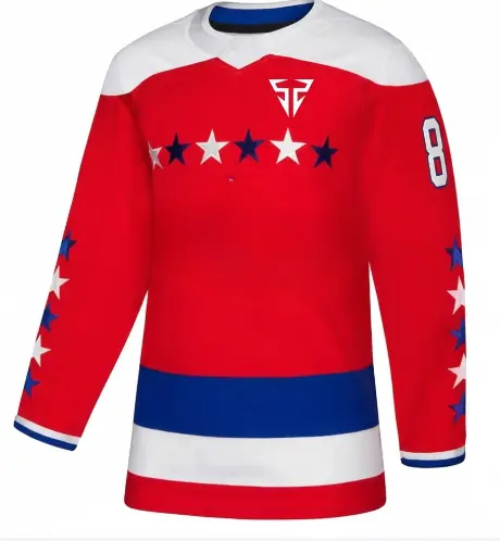 Play like a pro in this comfortable and stylish jersey. This jersey features a bold red base with white and blue accents that give it that classic, patriotic hockey look. The standout row of stars across the chest and sleeves makes an immediate visual impact on the ice. The team name and player number are written in BOLD letters on the jersey. The dye sublimation process is used for printing. This advanced permanent method ensures the design will not crack, peel, or fade, regardless of how many games, practices, or washes it endures.