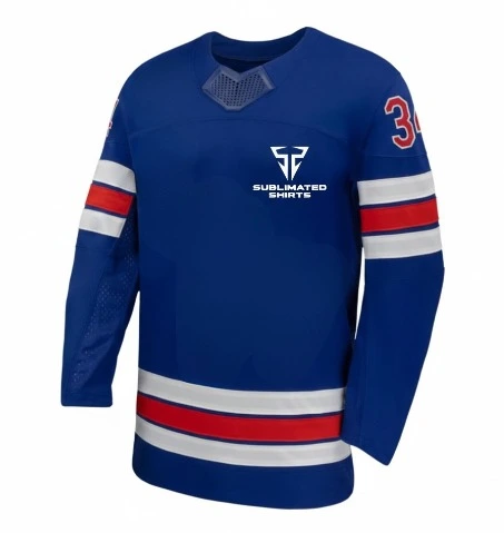 This jersey features a bold royal blue base with white and red striped accents that give it that classic hockey look. The clean design with striped sleeves and bottom creates a sharp and powerful appearance on the ice. The team name and player number are written in BOLD letters on the jersey. The dye sublimation process is used for printing. This advanced permanent method ensures the design will not crack, peel, or fade, regardless of how many games, practices, or washes it endures. The best thing about this is that you can customize it according to your own team name and number, making each piece truly unique to the player or devoted fan. You can also change the color according to your choice and upload your own logo at no extra cost. The jersey is perfect for teams as well as individual players. This jersey is specially made for hockey players and can be used by school teams, club leagues, beer league teams, sports fans, and anyone who loves hockey.