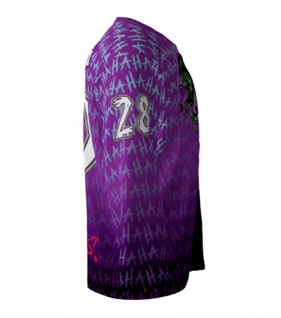 Premium polyester and spandex blend fabric is used to make this. The sublimation dye process is used for its printing which makes it more special. Its design is fully customizable and you can customize yours with your team names and numbers. This jersey stands out from regular jerseys with its unique vibrant purple color with chaotic laughter text pattern throughout and bold graphic design.