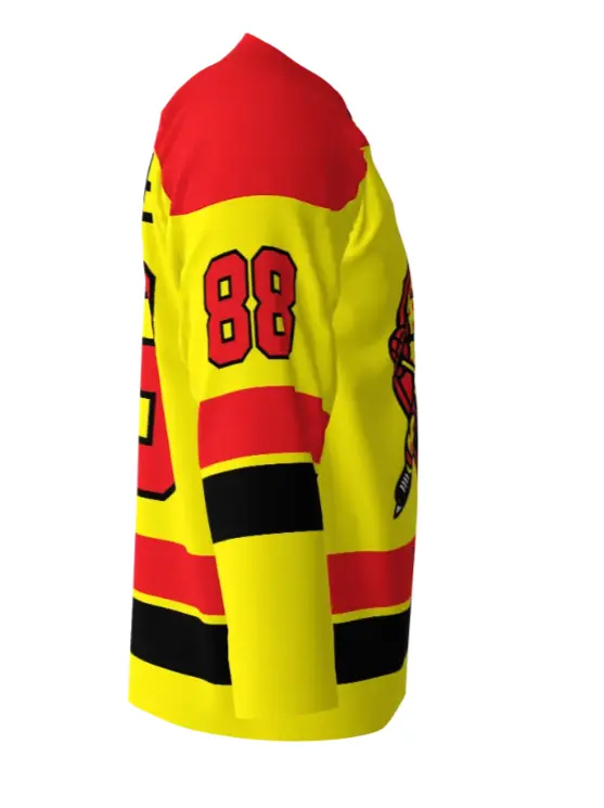 This jersey stands out from regular jerseys with its bold yellow body, red shoulder panels, and classic red and black striping across the sleeves and bottom hem. The long sleeves provide extra coverage and warmth, making it perfect for ice hockey or roller hockey games. It protects your arms while maintaining breathability.