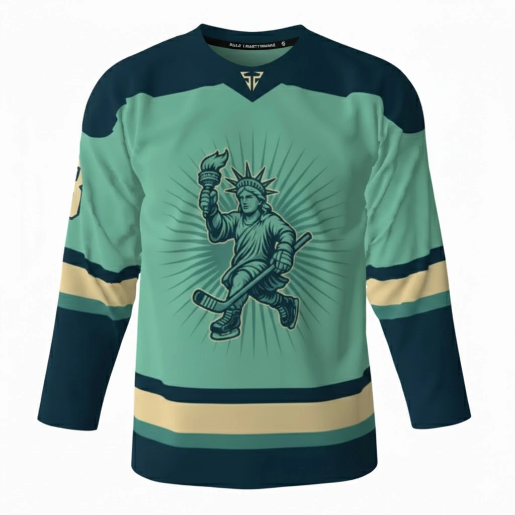 Play like a pro with this long-sleeve hockey jersey. The Liberty Green Hockey Jersey features a long-sleeve design that gives you more ease and comfort during games and practice. It allows you full arm movement which makes it perfect for training and playing. Its unique design features a bold mint green body with navy blue and gold striped accents on the sleeves and bottom. Its modern athletic look gives you another level of confidence. This comfortable jersey is perfect to wear both for games and casual wear.