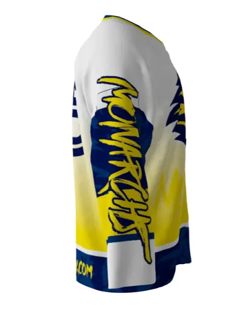 Play like royalty with this custom Monarchs White Hockey Jersey. Its long-sleeve design keeps you protected and comfortable during every game and practice. It allows you full arm movement which makes it perfect for competitive hockey and training. This professional jersey is perfect to wear for games, practice, and team events.