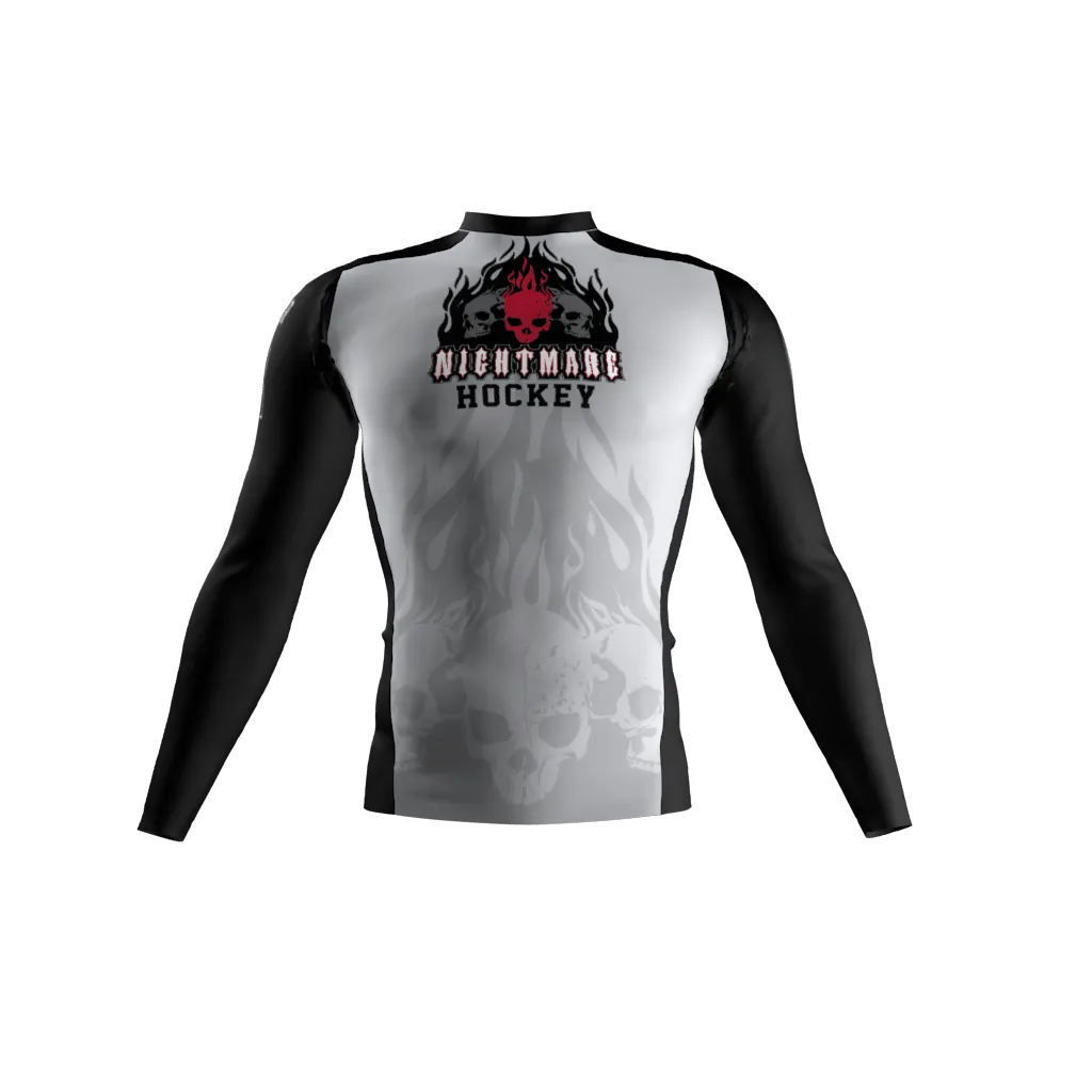 Try the arena or field with an undeniably dark and powerful presence in the Nightmare Compression Shirt. This is far more than a mere piece of athletic wear; it’s a meticulously crafted garment engineered to provide essential muscle support while projecting a formidable, menacing aesthetic that will unsettle your adversaries. The shirt boasts a dominant white torso subtly adorned with ghostly grey skull and wispy flame patterns, creating an eerie, atmospheric backdrop. This haunting central design is sharply contrasted by sleek black long sleeves and side panels. Across the chest, a striking graphic boldly proclaims “NIGHTMARE” in fiery red with stark black outlines, accompanied by menacing red flames and additional skulls, with “HOCKEY” positioned below, instantly broadcasting your team’s dark and unyielding spirit.