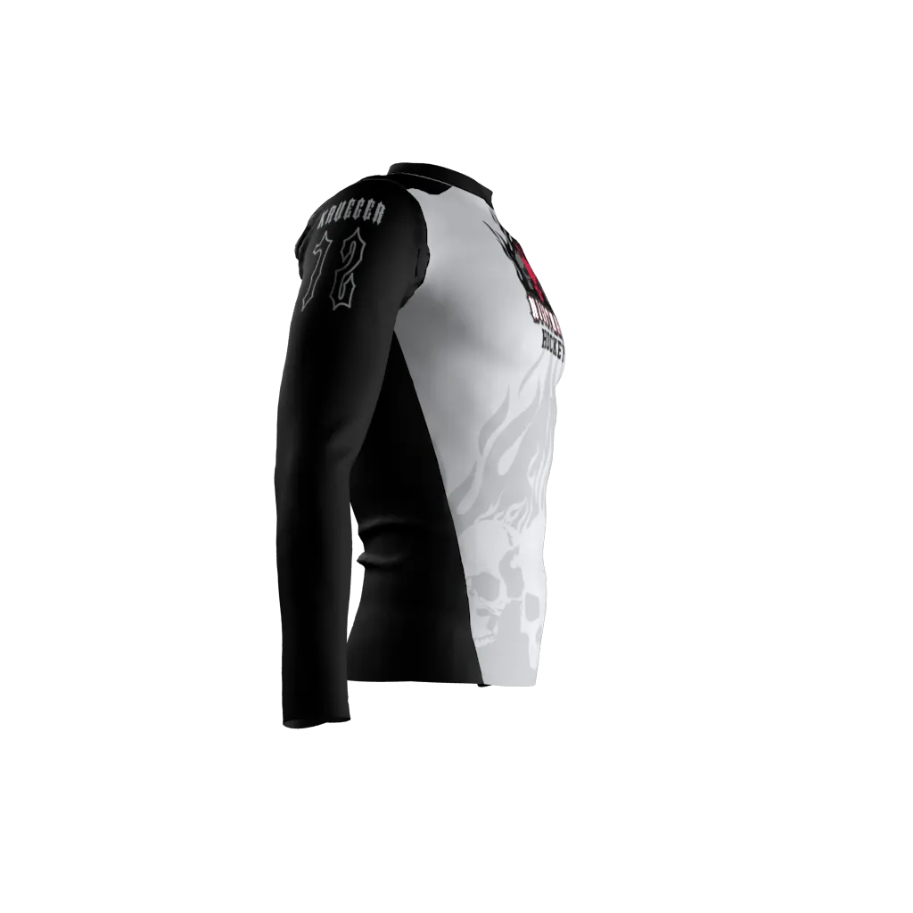 Precision-engineered for the most rigorous training and intense competitive moments, this compression shirt is constructed from a premium, breathable, and moisture-wicking fabric. This advanced material delivers comfortable yet firm compression, actively working to minimize muscle vibration and delay fatigue, making it an indispensable choice for high-intensity workouts, competitive events, or any activity where sustained power and a dry, cool feel are paramount. The bold graphics, subtle background patterns, and crisp lettering exhibit remarkable clarity and enduring brilliance. This is achieved through an advanced dye sublimation printing process, which permanently infuses every white, black, grey, and red element, including the team name, skulls, and intricate flame details, directly into the fabric’s fibers. Unlike superficial applications, this method guarantees that your team’s dynamic visuals and powerful motifs will retain their pristine, impactful appearance without any cracking, peeling, or fading, even after countless wears and washes. This inherent durability ensures your shirt remains a formidable and cherished piece season after season.