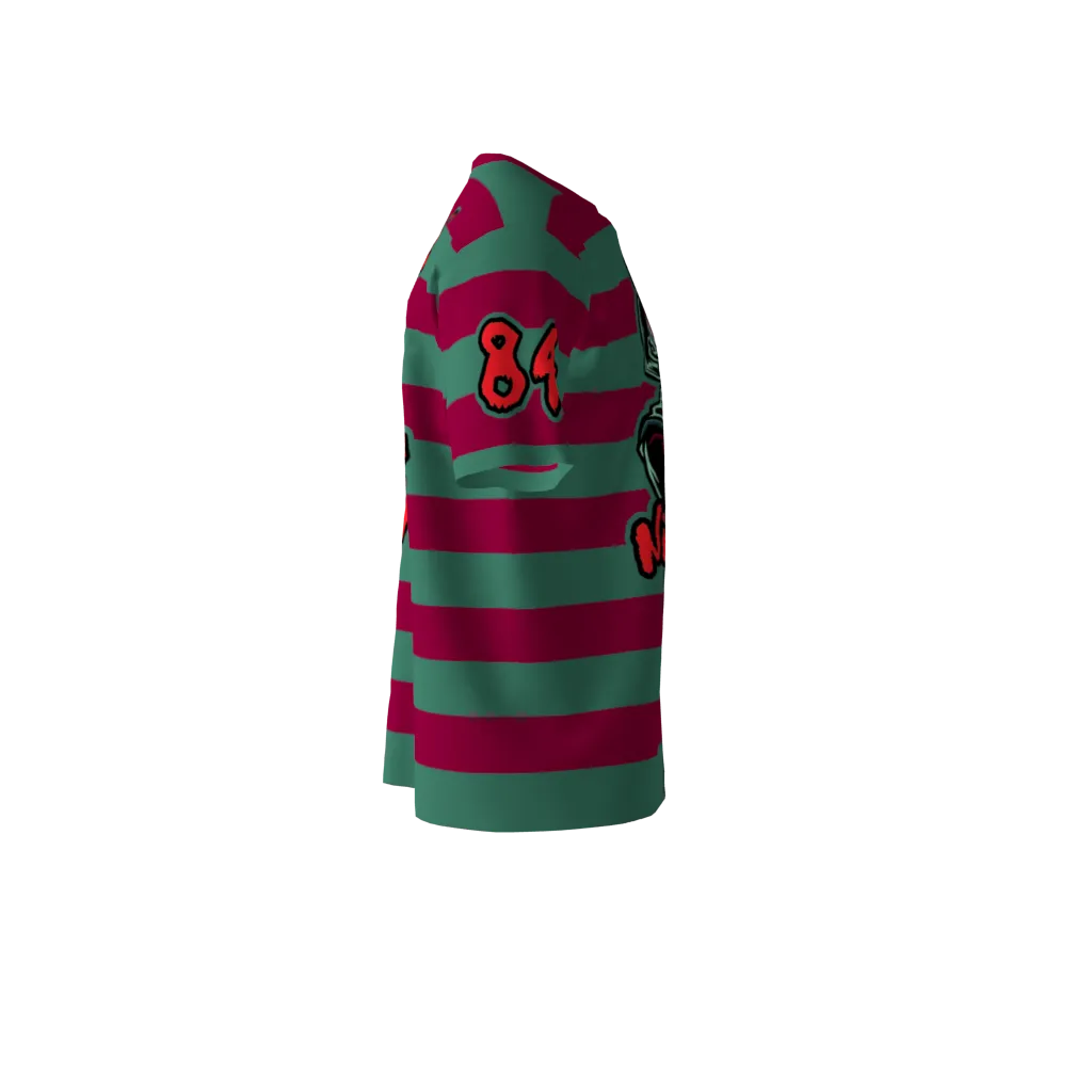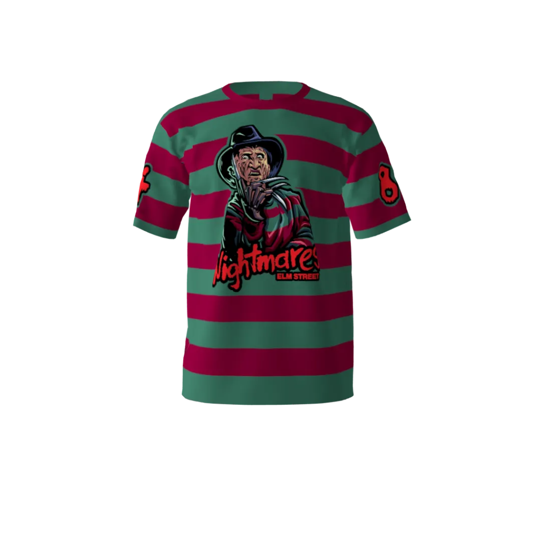Dare to unnerve the competition with the Nightmares Softball Jersey. This is more than just a team uniform; it’s a bold, thematic statement, designed for squads that want to bring a chilling edge to their game and stand out with a truly unique aesthetic. The jersey’s design immediately captivates with its alternating horizontal stripes of deep, ominous red and cool, eerie green. These colors evoke a classic horror motif, setting an unsettling tone on the field. At the center of this striking pattern is a graphic of Freddy Krueger, rendered in a detailed, menacing style, complete with his signature hat, striped sweater, and clawed glove reaching forward. Beneath him, the word “Nightmares” is prominently displayed in a jagged, custom font, with “ELM STREET” appearing subtly below, clearly referencing the iconic horror franchise. Player numbers are typically placed on the sleeves or back, completing this distinctive and unsettling design.