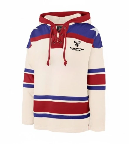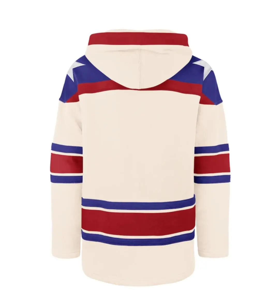 The bold team name is written right at the front with the player number displayed in large, eye-catching font. This jersey features a clean cream base with bold blue and red striped shoulders and sleeves that give it that classic vintage hockey feel. The red hood with cream drawstrings adds a pop of color and style, while the blue and red horizontal stripes across the chest and sleeves create a sharp, retro look that stands out on the ice. The team name and player number are written in bold letters, giving you a sharp, professional appearance.
