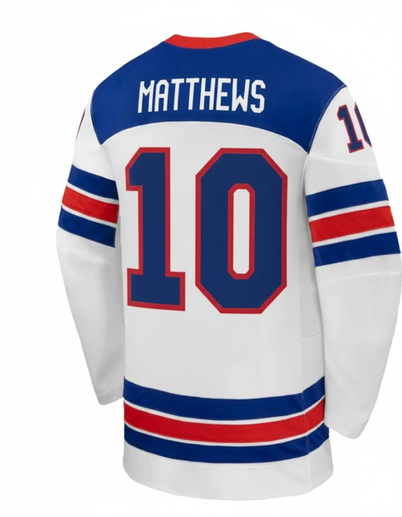 Play like a pro in this comfortable, stylish jersey. Bold blue and red striped color patterns are used to design it, featuring a striking white base with classic hockey aesthetics. The team name and player number are written in BOLD letters on the front and back of the jersey, giving you that authentic professional hockey look. The dye sublimation process is used for printing.